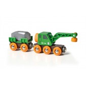 Lift, turn, and deliver. No matter what the goods are, the clever crane wagon for railway gets the job done. Up or down, on or off, turn the crank and get the rock load from the wagon. Off it goes on the BRIO train tracks.
