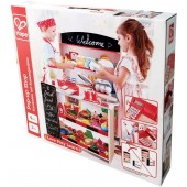 Preciosa tienda de madera con escáner portátil que pita y parpadea al pulsar el botón de la parte trasera. Con la calculadora podrán cobrar a los clientes y utilizar el datáfono para los pagos con tarjeta.