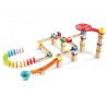 Contiene fichas de dominó, bloques, canicas y todo lo necesario para construir la pista (una campana que suena al paso de las canicas, un carril en espiral, una rueda...).