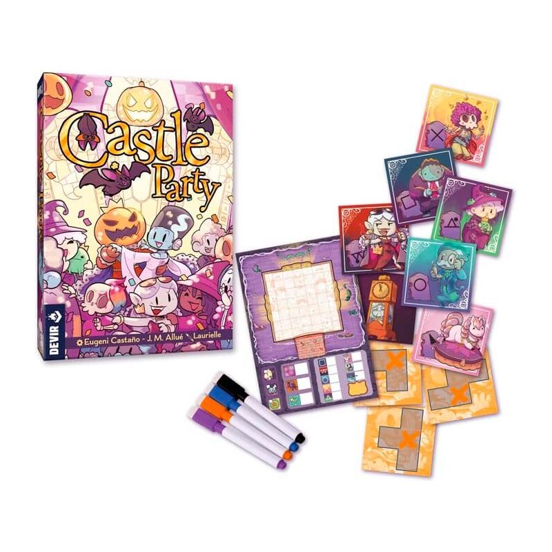 Cada año el rey Calabaza nos invita a su castillo para celebrar la fiesta de otoño en su honor. Castle Party es la fiestuqui más loca, sin duda la cita ineludible para cualquier monstruo que pinte algo en el mundo de las pesadillas. ¡No te la quieres perder por nada! Los invitados van llegando al castillo del rey Calabaza y, como es habitual, se van formando los grupitos: los vampiros más sofisticados alternan entre ellos vacilando de capa molona; los monstruos del doctor Frankenstein, tímidos, prefieren compañía entre ellos; los fantasmas miran con arrogancia a todos los demás, y los esqueletos vienen a liarla pardísima, haciendo que los demás intenten evitar estar cerca. Este es un juego de “flip and write”. Es decir, sacaremos cartas y escribiremos cosas en una pizarra. El jugador activo revelará una carta con una forma polinómica y todos los jugadores colocarán sobre la mesa una carta de monstruo siguiendo la forma propuesta. Finalmente, dependiendo del lado de la mesa desde el que estén viendo la carta de forma, los jugadores dibujarán los monstruos en sus tableros personales,
