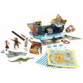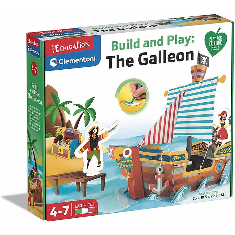 Contiene varios elementos con siluetas de cartón para ensamblar y crear un bonito galeón en 3D.