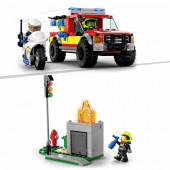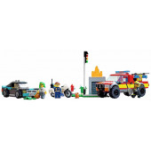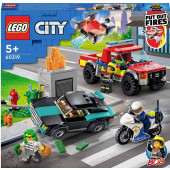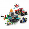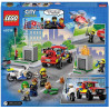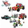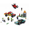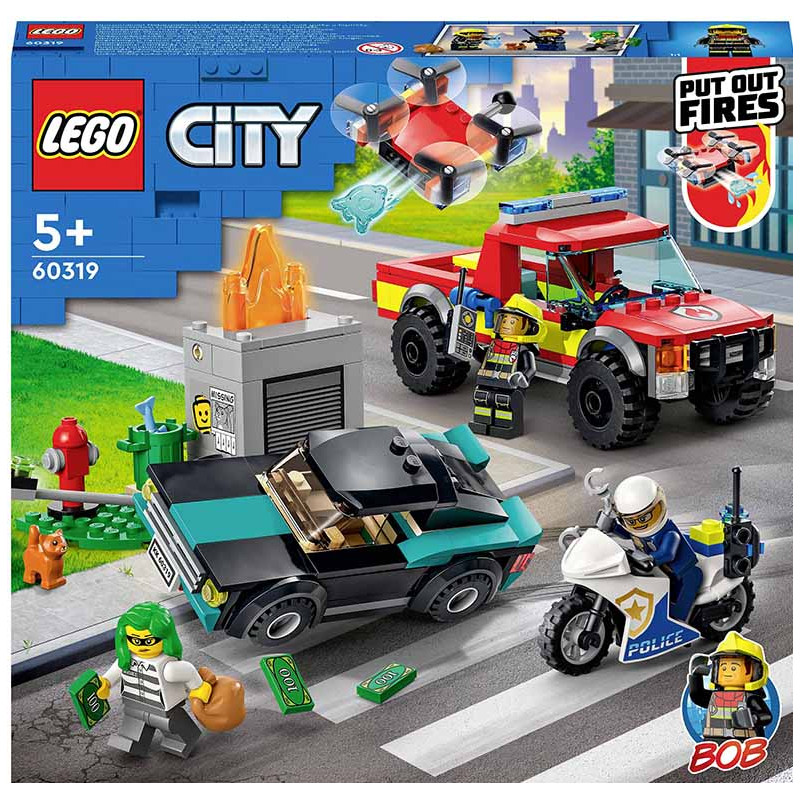 Este set incluye una furgoneta de bomberos con dron, una moto de policía y un coche de fuga de una ladrona, una escena de un incendio con un semáforo, una figura de un gato y 3 minifiguras, entre ellas Bob, el bombero de la serie LEGO City: Aventuras en la Ciudad.