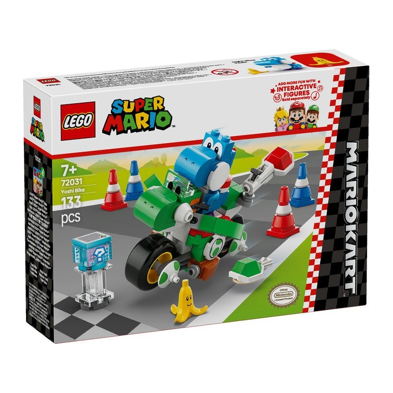 Este set incluye la figura de Yoshi azul claro en su moto haciendo zigzag entre 4 conos de tráfico, a la vez que lanza caparazones desde la moto y esquiva un plátano.