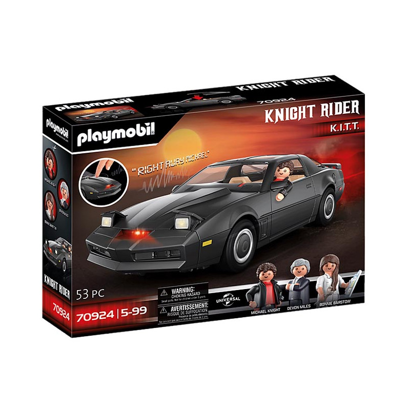 El coche fantástico es una trepidante aventura de un hombre que no existe, en un mundo lleno de peligros. Michael Knight, un joven solitario embarcado en una cruzada para salvar la causa de los inocentes, los indefensos, los débiles, dentro de un mundo de criminales que operan al margen de la ley". Un detective que se creía muerto, ahora con una nueva identidad. Le mueve la justicia y se propone acabar con el crimen con la ayuda de K.I.T.T., un coche futurista con inteligencia artificial y equipado con artilugios y armas de alta tecnología. Ahora K.I.T.T., el legendario coche de la serie de éxito de los 80 Knight Rider, llega a la flota de coches PLAYMOBIL. Al igual que su hermano mayor, PLAYMOBIL K.I.T.T. está equipado con toda una serie de funciones auténticas, como una simulación de impresora debajo del salpicadero para imprimir fotos de la ficha policial, una matrícula giratoria, una cuerda con gancho de agarre, faros emergentes y un techo desmontable. K.I.T.T. cuenta con sonidos y luces electrónicas que se accionan mediante una función táctil en el capó. El vehículo cita frases de la serie con la icónica voz original de K.I.T.T. Las citas específicas están asociadas a la función de encendido/apagado y las demás se reproducen de forma aleatoria. Al mismo tiempo, la icónica luz del escáner de la parte delantera del vehículo se enciende y la luz del salpicadero parpadea. Además del personaje, Michael Knight, el set de juego también incluye accesorios muy detallados, como el laboratorio informático de Bonnie Barstow y los muebles de la oficina de Devon Miles. Ahora es el momento de subir al coche y conducir hacia la siguiente misión.